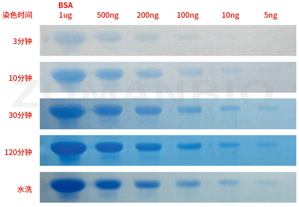 泡染2-10min即可觀察蛋白大?。磺野踩珶o毒無刺激性氣味。