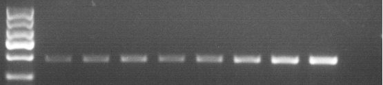 注:收集一定數(shù)量的293T細(xì)胞,使用本試劑盒提取總RNA,  10μl洗脫,取3μl進(jìn)行RT-PCR實(shí)驗(yàn)。上圖即為RT-PCR電泳結(jié)果,可以看到,細(xì)胞數(shù)量在1*102-8*102范圍內(nèi),均有PCR條帶,且條帶亮度成梯度增加。