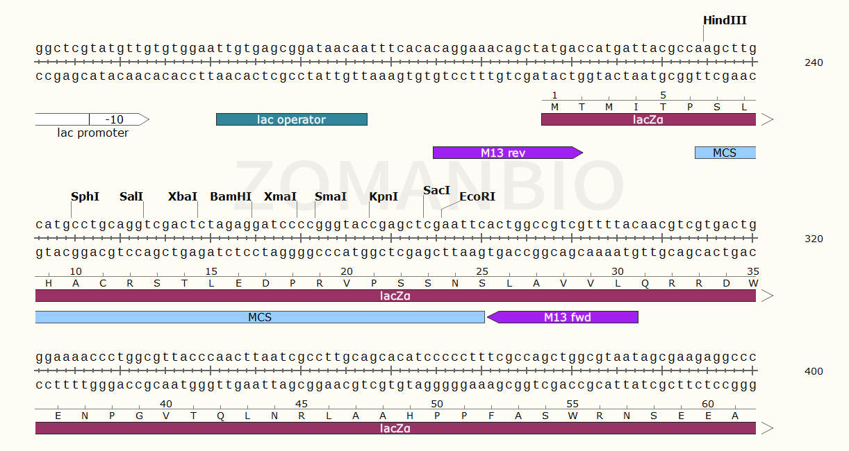 pUC119載體是利用pUC19載體的Nde I 酶切位點,插入含有M13 phage DNA Intergenic region (IG) 的HgiA I (5645) - DraI (5941) 片段構(gòu)建而成的。由于在lacZ基因中含有多克隆位點,因此在含有IPTG、X-Gal的平板培養(yǎng)基上可以很容易地通過藍(lán)白篩選判斷載體中有無DNA片段的插入。同時還可以通過載體上的lac promoter表達(dá)外源基因,使用M13系列的通用引物對插入載體中的DNA片段進行測序。使用Deletion Kit for Kilo-Sequence (Code No. : 6030) 可以對克隆得到的數(shù)千堿基的DNA片段進行測序。