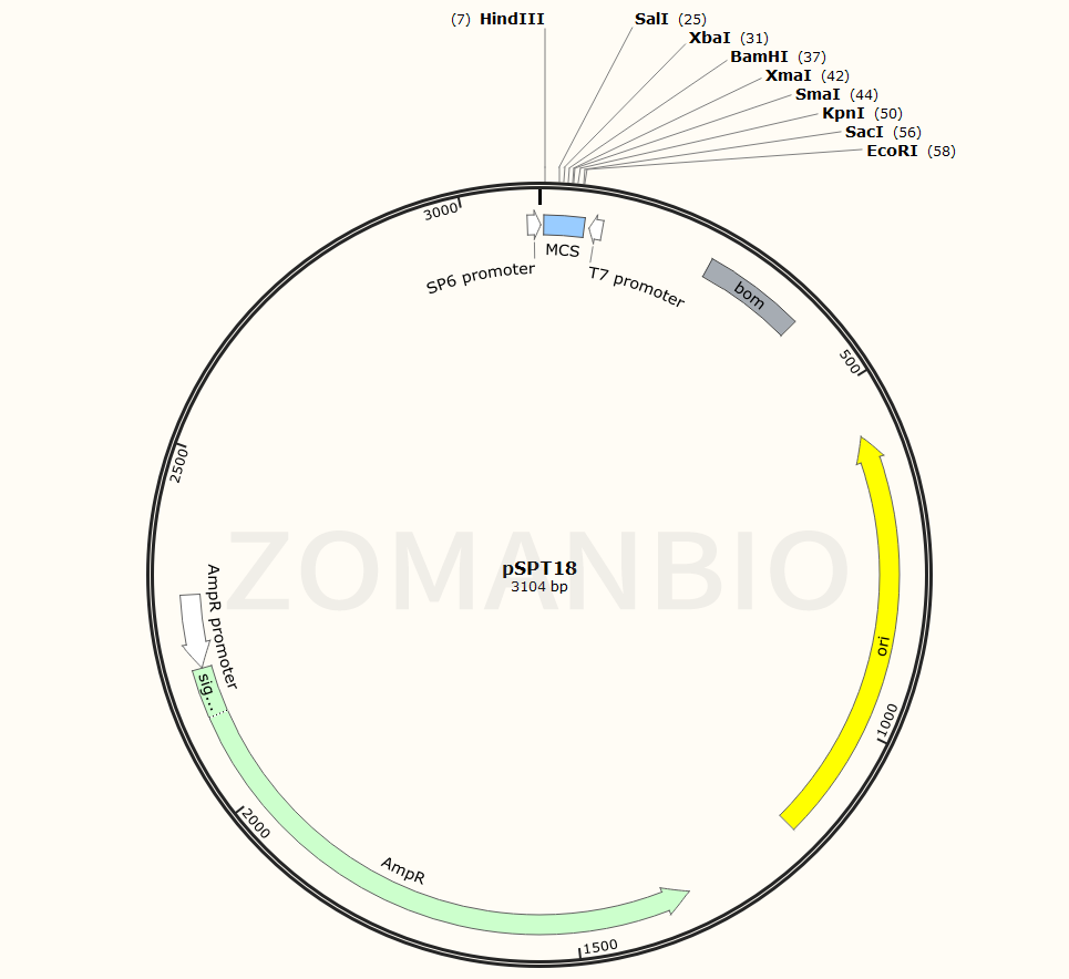 pSPT18是一個高拷貝質粒,質粒長度為3104bp,含有Amp青霉素抗性基因,復制子為pBR322 ori。