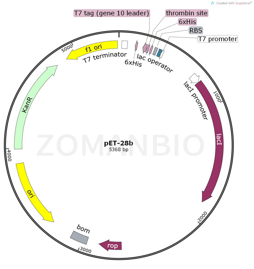 pET-28b載體帶有一個N端的His/Thrombin/T7蛋白標簽,同時含有一個可以選擇的C端His標簽。pET28b載體的單一的 多克隆位點見上面的環(huán)狀質粒圖譜。注意:載體序列是以pBR322質粒的編碼規(guī)矩進行編碼的,所以T7蛋白表達區(qū)在質粒圖譜上面是反向的。T7 RNA聚合酶啟動的克隆和表達區(qū)域在質粒圖譜中也被標注了出來。質粒的F1復制子是被定向的,所以在T7噬菌體聚合酶的作用下,包含有蛋白編碼序列的病毒 粒子能夠產(chǎn)生,并啟動蛋白表達,同時蛋白表達將被T7終止子序列的作用下終止蛋白翻譯。質粒只保證關鍵序列正確,不保證表達效果。