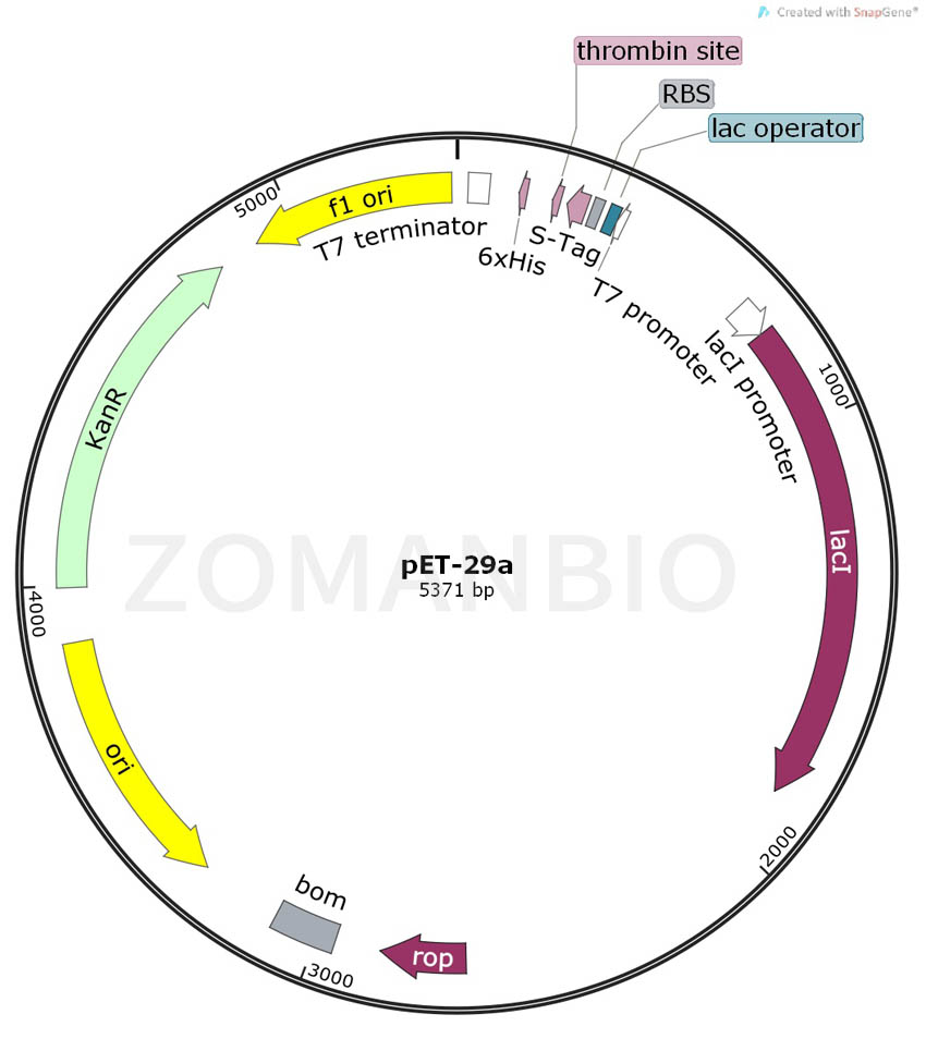 pET-29a質(zhì)粒是一種原核表達(dá)載體,C端含有一個6×His標(biāo)簽,N端含有一個thrombin位點和S標(biāo)簽。該質(zhì)粒含有多個常用的酶切位點,便于不同基因克隆。表達(dá)由宿主細(xì)胞提供的T7 RNA聚合酶誘導(dǎo),目的基因被克隆到質(zhì)粒載體上,受噬菌體強(qiáng)轉(zhuǎn)錄及翻譯信號控制。