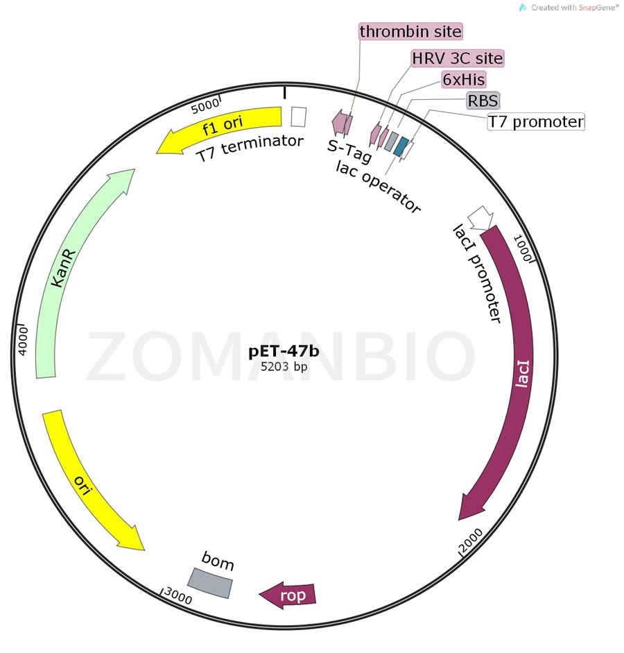 pET47b載體攜帶有N端His純化標(biāo)簽,緊跟著有一個(gè)HRV 3C蛋白酶切位點(diǎn)。這個(gè)HRV 3C蛋白酶切位點(diǎn)能夠特異性的高效 切割 “LEVLFQ↓GP”氨基酸序列,酶活力在低溫下很強(qiáng)。pET-50b(+)載體上還含有一個(gè)可選擇的C端Thrombin蛋白酶切位點(diǎn)和S標(biāo)簽序列。